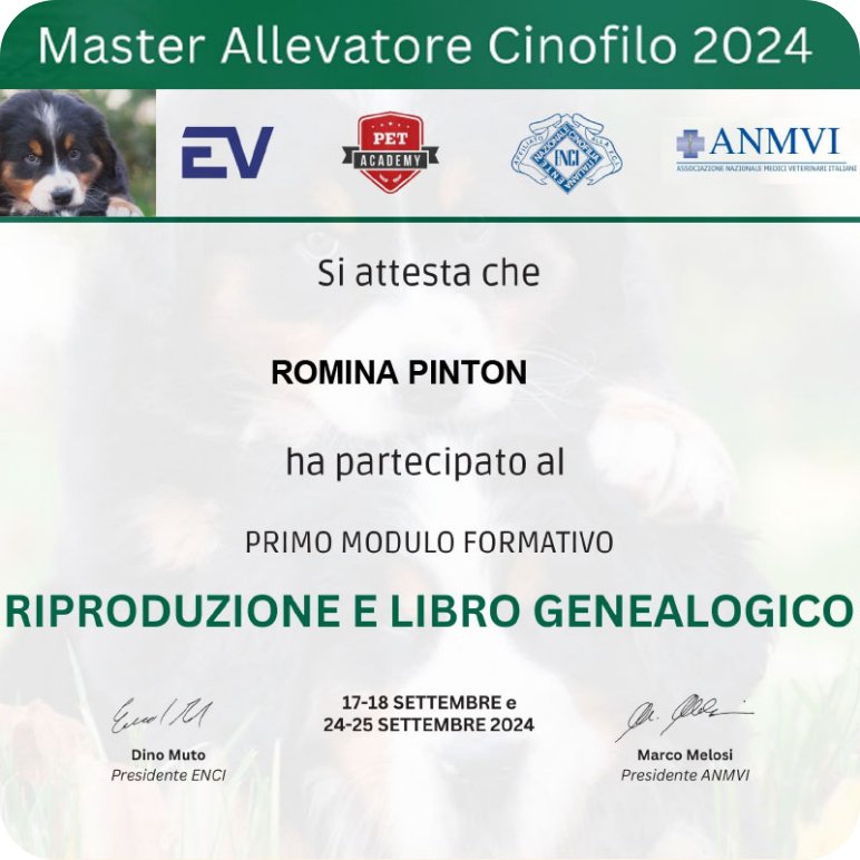 Abbiamo inoltre conseguito il Master Allevatore Cinofilo Italiano, un percorso formativo certificato ENCI che ci abilita alla gestione delle riproduzioni e del libro genealogico con competenza e aggiornamento costante.